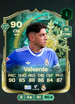 - Valverde (90 CM - Winter Wildcards): Aktualnie jedna z lepszych kart dostępnych na pozycji ŚP. Bardzo dobre playstyle, wyśmienite statystyki na karcie, oraz sama sylwetka sprawiają, że jest to karta absolutnie topowa.